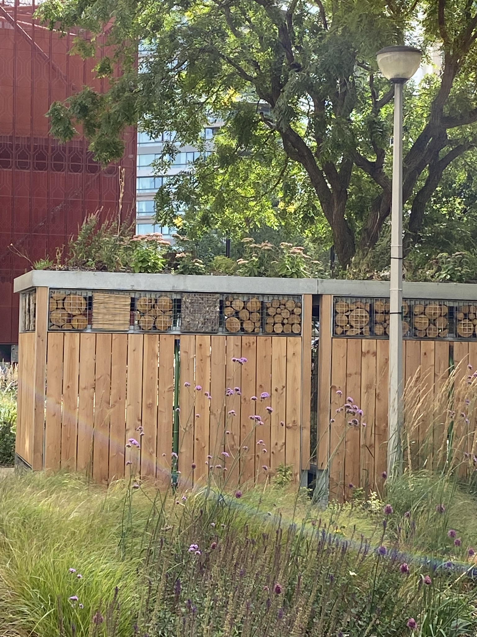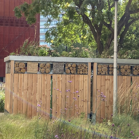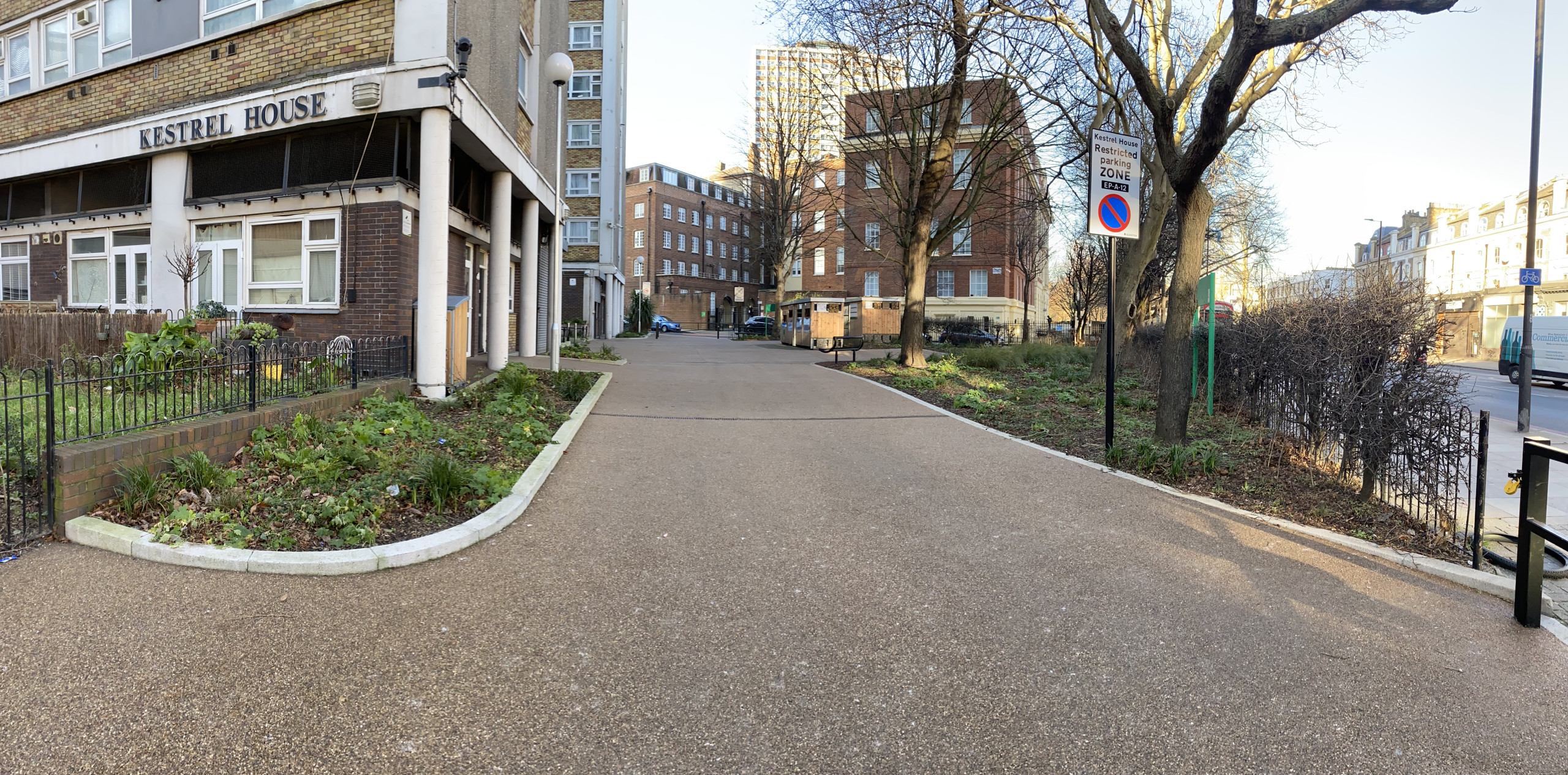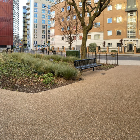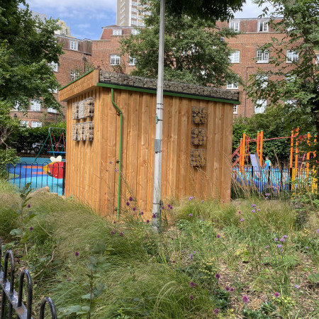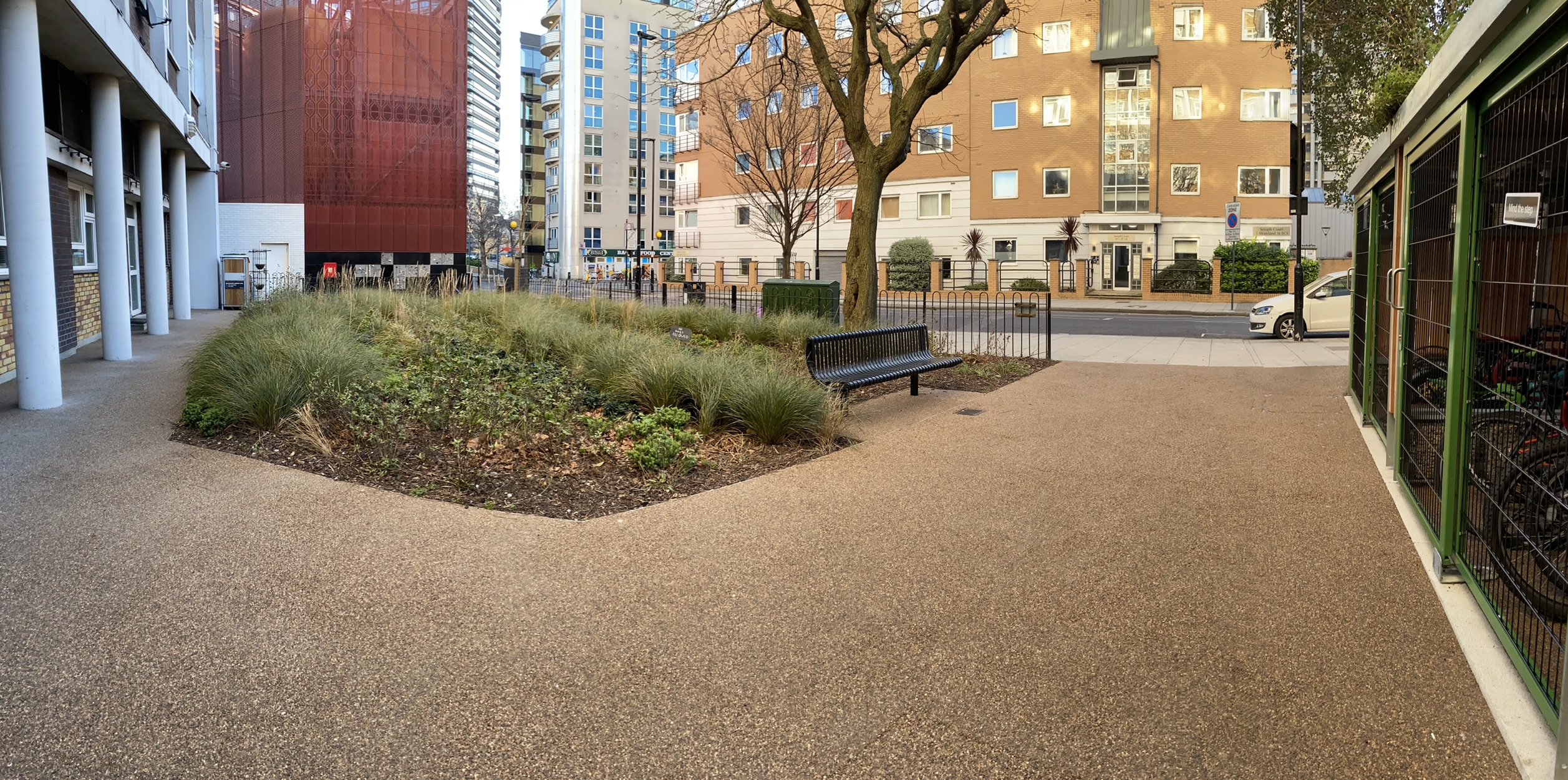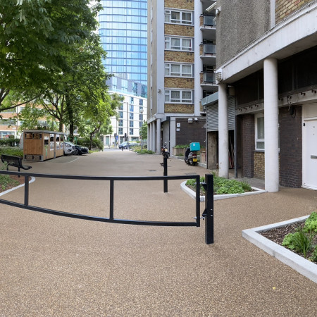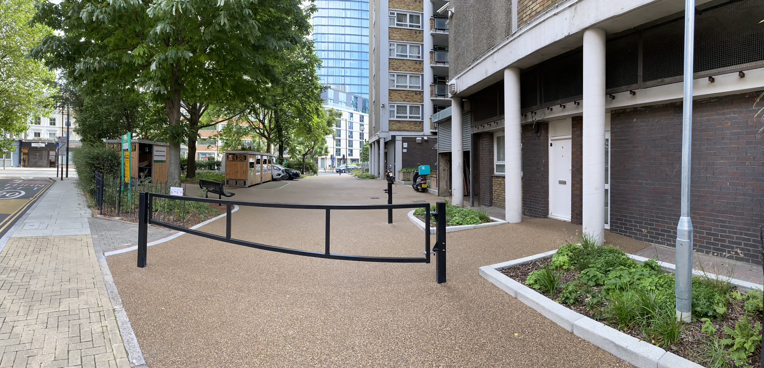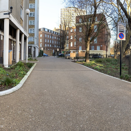 A rather challenging project based around a block of residential flats housing around four hundred residents with new surfacing, gardens, refurbished play area and bike- refuse green roof stores.